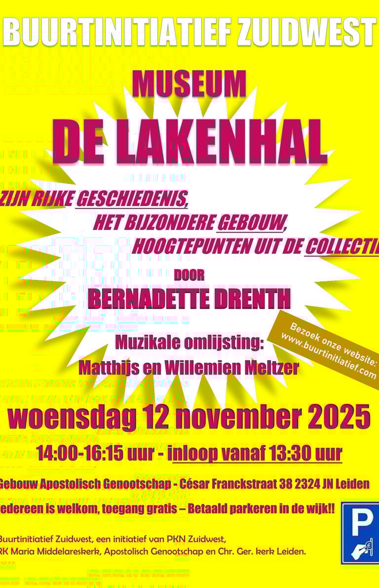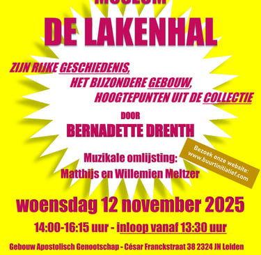 Volgende bijeenkomst Op woensdag 12 november komt mevrouw Bernadette Drenth van Museum De Lakenhal vertellen over de rijke historie van het museum. Ook vertelt ze over het bijzondere gebouw en over topstukken uit de collectie. De bijeenkomst is NIET in De Lakenhal, maar in het gebouw van het Apostolische Genootschap, César Francksstraat 38 in Leiden. Inloop vanaf 13.30 uur. Start om 14.00 uur. Einde rond 16.15 uur. Toegang is gratis. Iedereen is welkom!